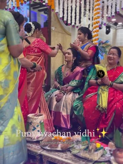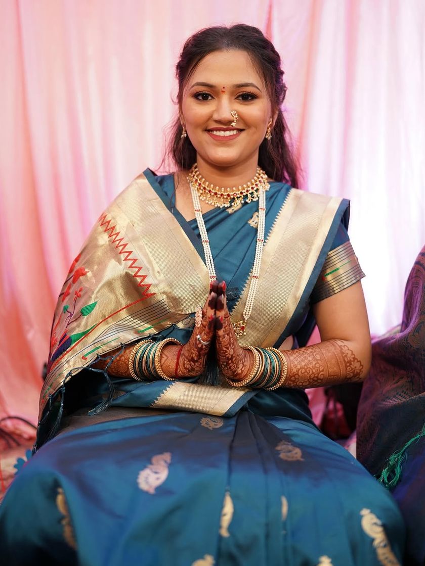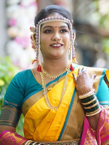 I provide an all-inclusive service for your main wedding day, covering makeup, traditional Khopa hairstyling, and expert saree draping for both Paithani and Nauvari styles. This look is designed to be timeless, radiant, and last through all the ceremonies.