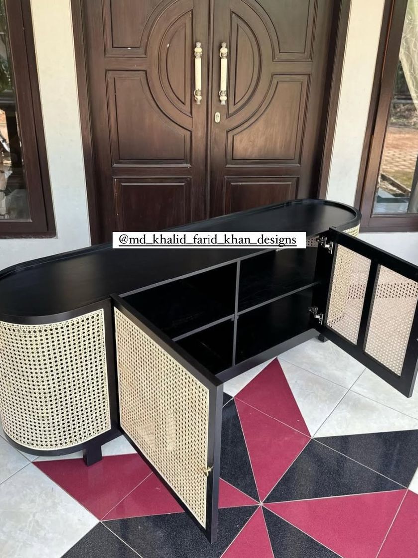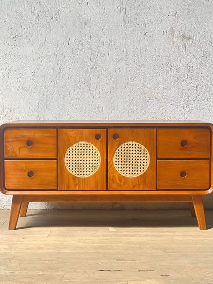 My storage solutions are both functional and beautiful, designed to complement your space. This includes media consoles, sideboards, and cabinets featuring details like cane or slatted doors, available in various woods like teak and ash, and customizable finishes.