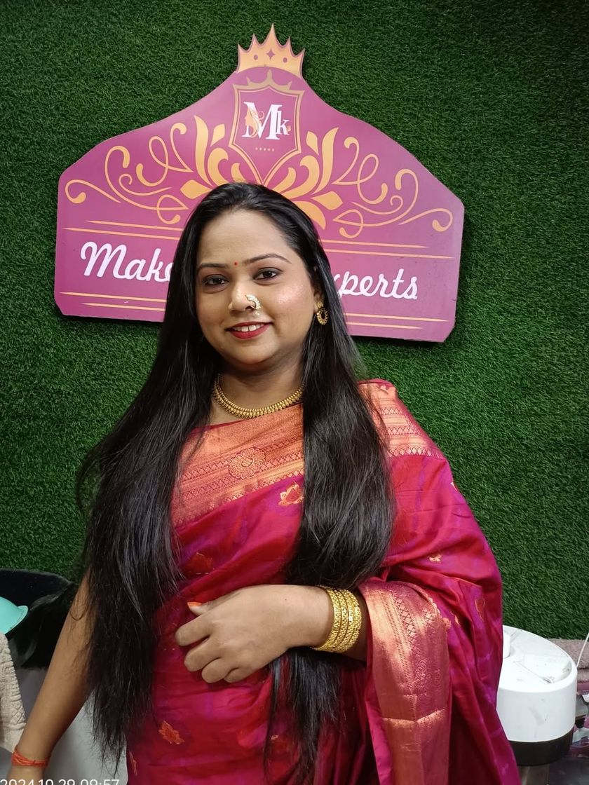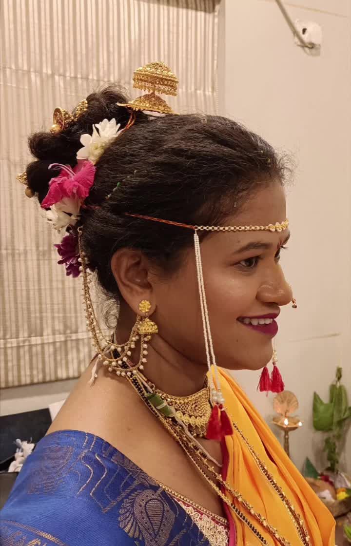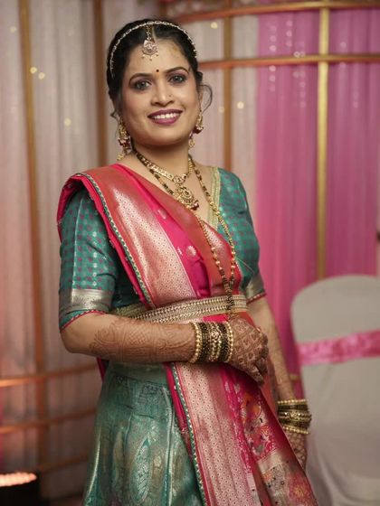 This is my absolute passion. I specialize in creating the complete Maharashtrian bridal look, from flawless HD makeup and traditional ambada buns to perfect Nauvari saree draping. I also provide authentic jewellery like the nath and mundavalya for rent to complete your look.