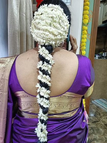 A perfect hairstyle completes any traditional look. I create all kinds of hairstyles, from classic buns (ambada) decorated with fresh flowers and accessories to elaborate braids perfect for both sarees and lehengas.
