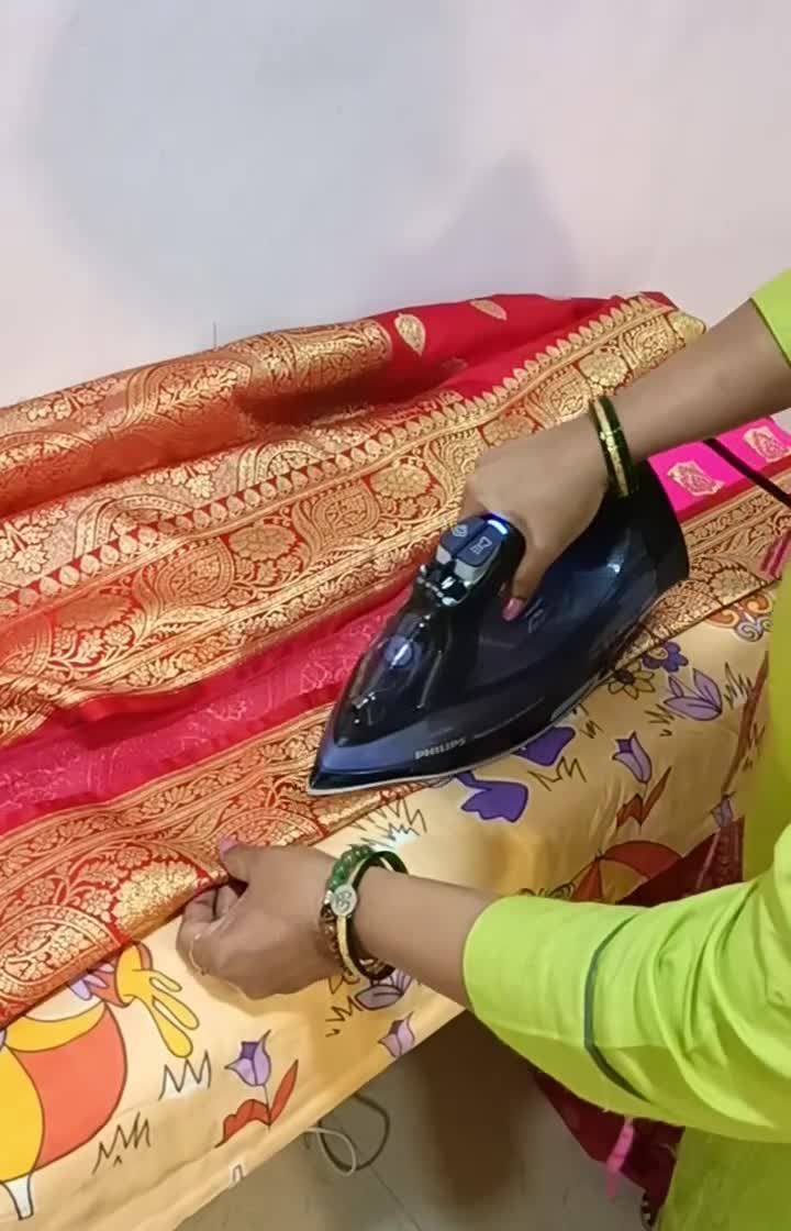 I show you my biggest hack for getting ready quickly: the pre-pleated saree. In my class, you will learn to iron and set perfect pleats ahead of time, so you are never in a rush for any function. This section shows the hands-on process for different types of sarees.