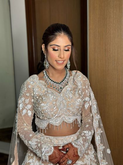 I’m Meenal, probably happiest when I’m lost in a makeup aisle or glamming up someone’s big day. Makeup’s not just work for me—it’s how I help people feel their best. Mumbai is home, but honestly, my makeup kit travels more than I do! I get to work with brides, celebs, and on crazy editorial shoots. Each face, new story. My favorite? Watching a bride’s smile when she sees that final soft glam bridal makeup look.