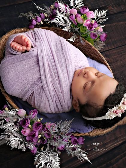 Dreamy & Artistic Baby Photography - I create enchanting scenes with flowers, baskets, and soft wraps. Your baby, a little work of art.