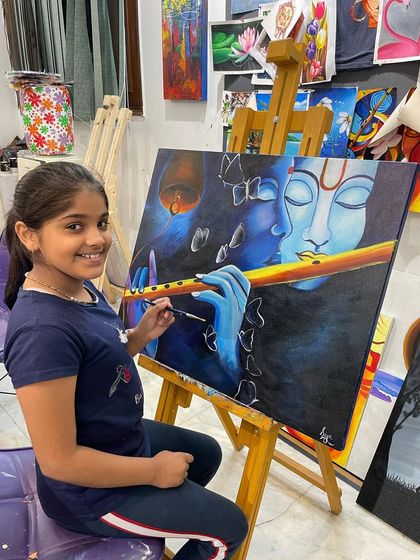 Hi, I'm Mehak and this is my art studio in East Delhi. Art for me is pure pyaar (love). Started with a portrait for my husband, then resin art hampers for Rakhi, and now, every custom order gets a little homemade surprise - maybe brownies! My students? They’re my little artists, my little santas. Watching a 6-year-old finish a canvas or a beginner shine in my two-day painting workshop - gives me goosebumps. Some pieces, like my Baba Nanak painting, are more than just art, they’re blessings.
