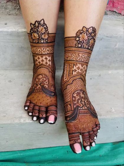 Your bridal look is complete with beautifully adorned feet. I provide full coverage from toes to ankle, ensuring the design complements your hand mehndi with matching themes, whether it's traditional motifs or personalized figures.