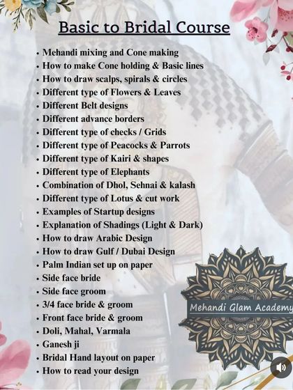 I teach mehndi art from basics to advanced bridal designs through live online and offline classes in Hindi and English, with practice materials and certification.