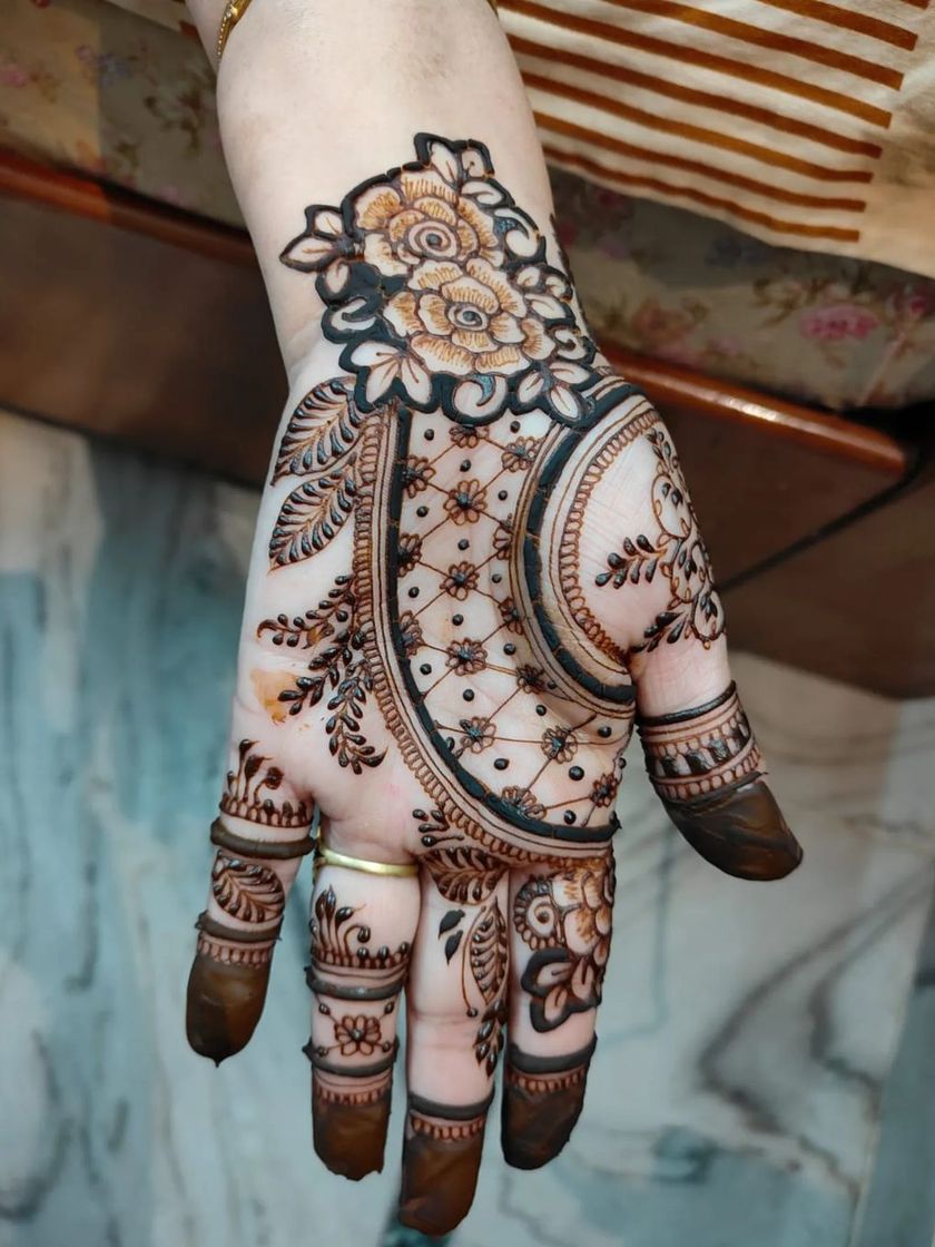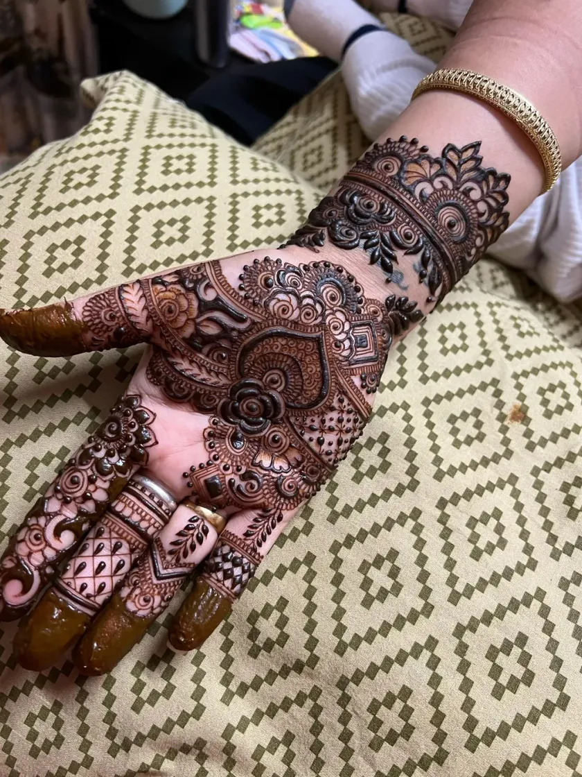 For those who love a contemporary look, I offer Arabic and modern mehndi. These designs are characterized by bold floral vines, geometric patterns, negative space, and stylish patch or mandala work.