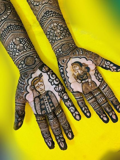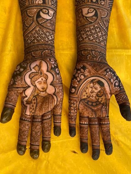 I specialize in creating lifelike portraits of the bride and groom, turning your hands into a beautiful canvas of your partnership. We can also explore unique themes, from Rajasthani royalty to modern cityscapes, to make your bridal mehendi unforgettable.