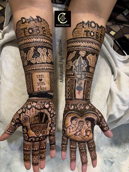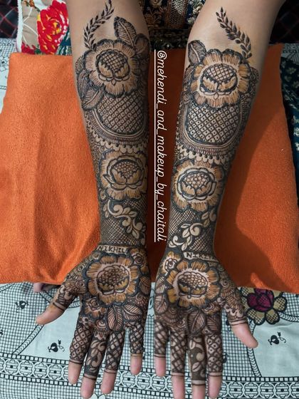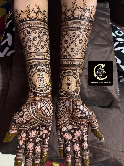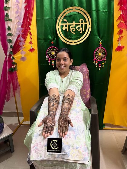 I am a one-stop bridal artist for mehendi, makeup, hair, and saree draping, available for home service. I specialize in custom portrait mehendi and use only my own homemade organic cones for a safe, dark stain.