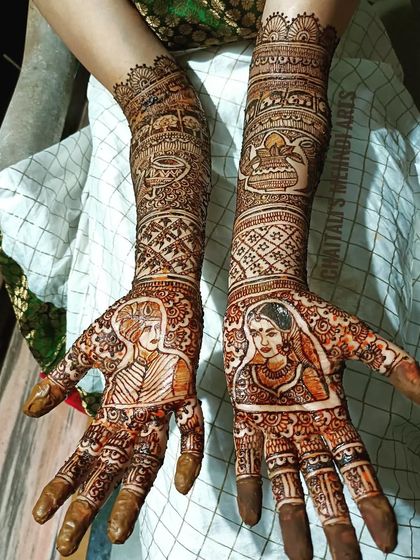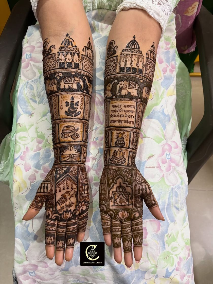 Your bridal mehendi should be as unique as your love story. I work closely with each bride to create a design that tells her story, incorporating everything from couple portraits and wedding dates to traditional motifs like dholis, elephants, and kalash. I do full arm and leg designs to complete your bridal look.