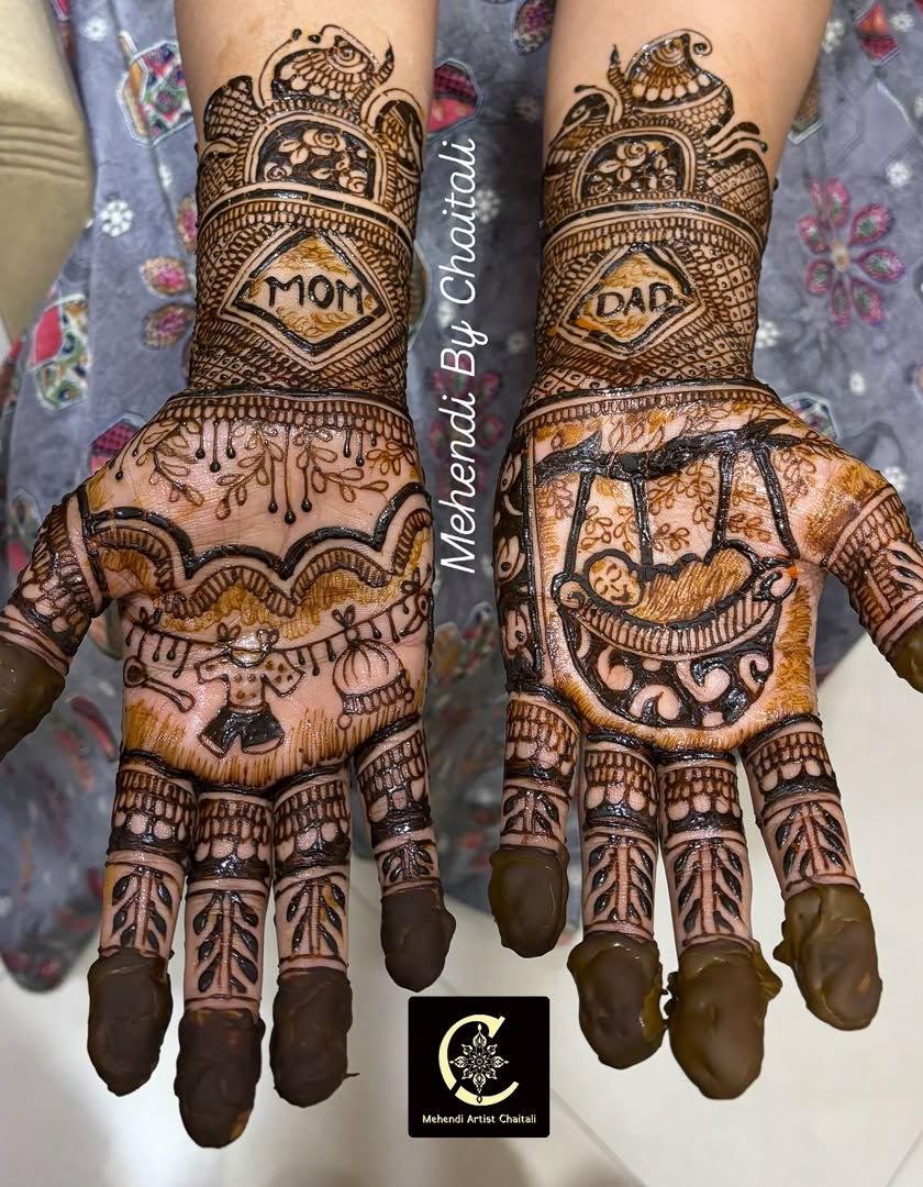 Celebrating the journey to motherhood is so special, and I love creating unique mehendi for baby showers. I can include cute elements like baby cradles, little feet, "Mom to be" text, or even portraits of the parents. It’s a beautiful way to capture the joy of this moment.