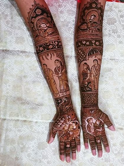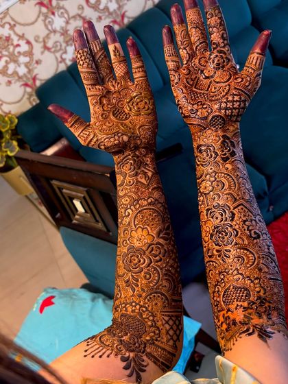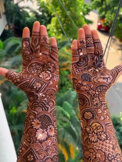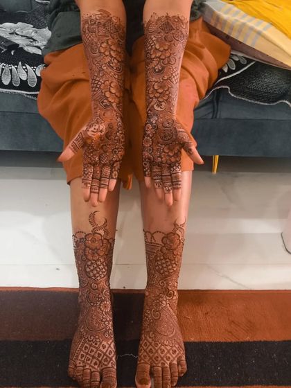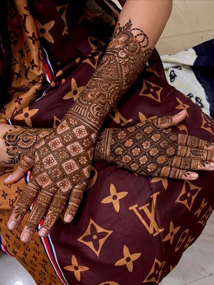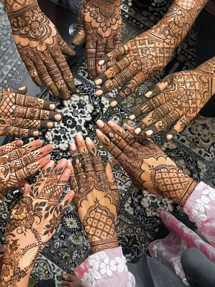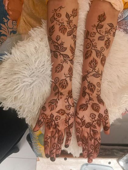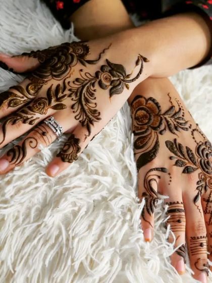 I create detailed, custom mehndi designs for weddings and special occasions using natural henna, with full coverage for hands and feet and personal touches like names or symbols.