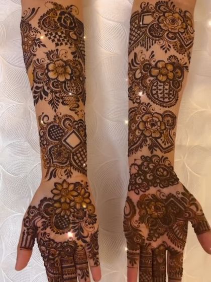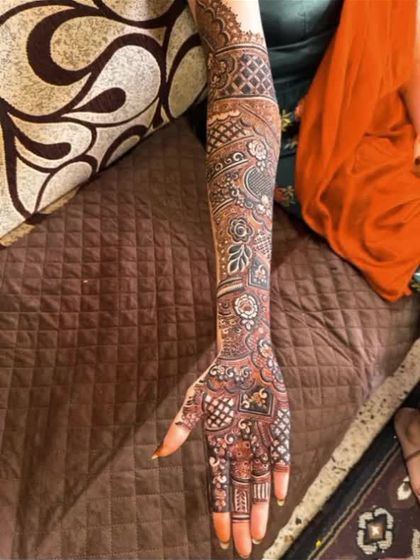 My specialty is full-coverage bridal mehndi that tells a story. These designs are incredibly detailed, extending from your fingertips to your elbows or beyond, ensuring you have the most breathtaking henna for your wedding day. I take my time with each bride to create a masterpiece.