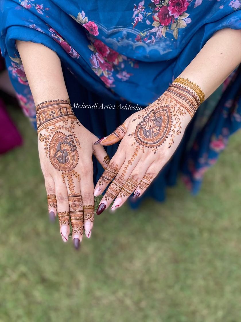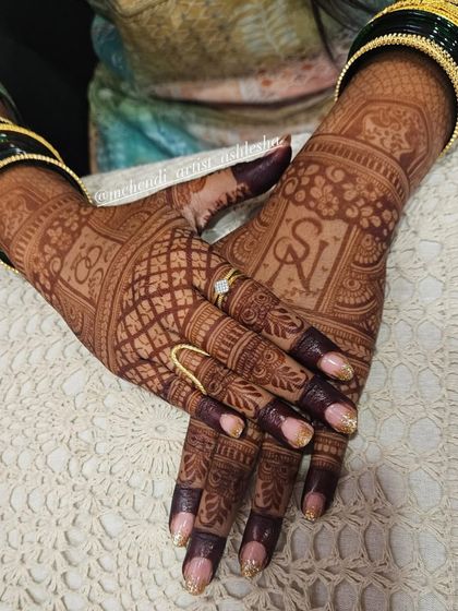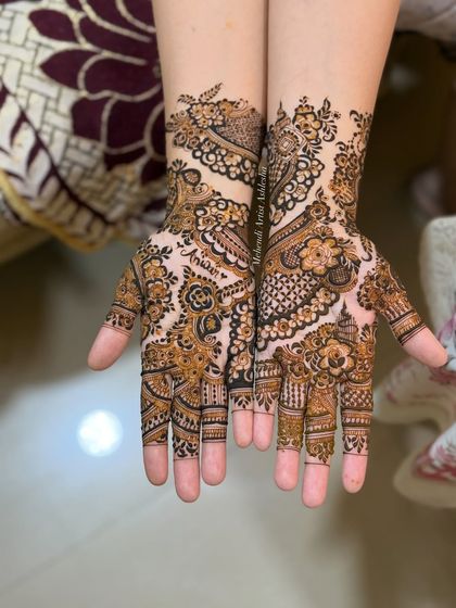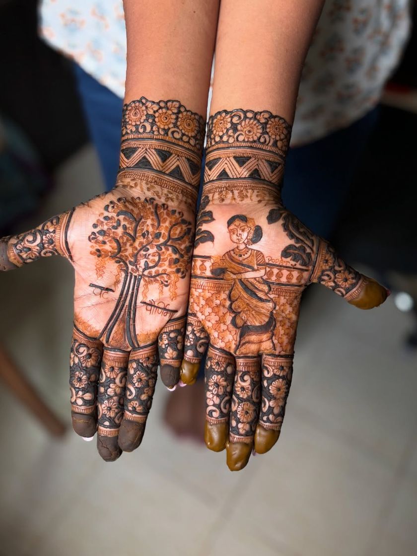 This is my specialty. I design full-coverage, intricate bridal mehendi that tells your unique story. We can incorporate everything from traditional motifs and symbols to personalized elements like names and vows, ensuring your hands are a masterpiece for your big day.