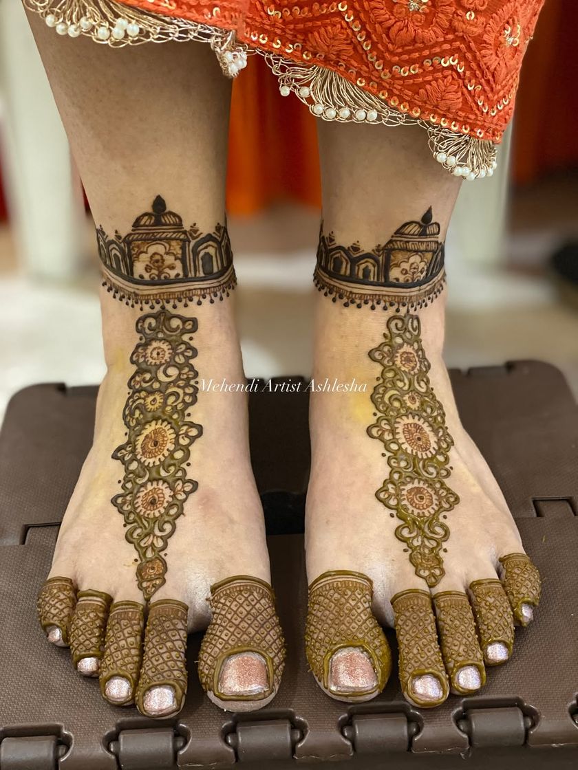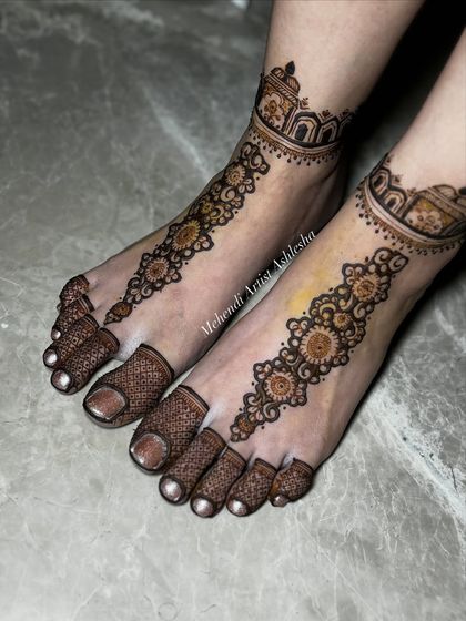 Your bridal look is complete only with beautifully adorned feet. I create designs ranging from heavy, full-coverage patterns that match your hand mehendi to elegant, minimal styles. Popular motifs include elephants, palanquins, and intricate jaal work.