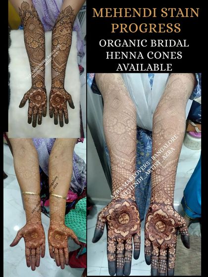 I make my own henna paste using fresh, organic henna powder to ensure a deep, dark, and long-lasting stain. I will also provide you with detailed aftercare instructions to get the best possible color from your mehendi.