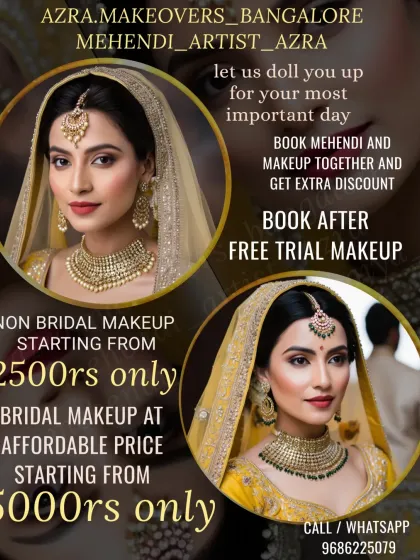 Hey, Azra here. Mehendi and makeup - that’s my jam, right here in Bangalore. I get a kick out of seeing brides light up when I add those little personal touches, like names or dates in their mehendi. Whether you want a full bridal look or just a simple party design, I’m all about making you feel good and looking fab. I love it when my art becomes a part of your memories.