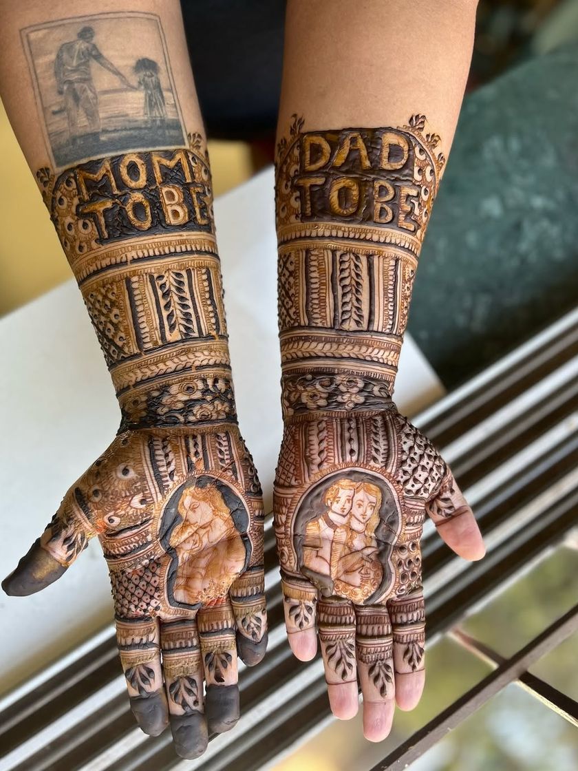 I create personalized mehendi to celebrate your journey to motherhood. We can include portraits of you and your partner, cute baby figures, your pet, or special words like 'Aai' and 'Baba' to make it uniquely yours.
