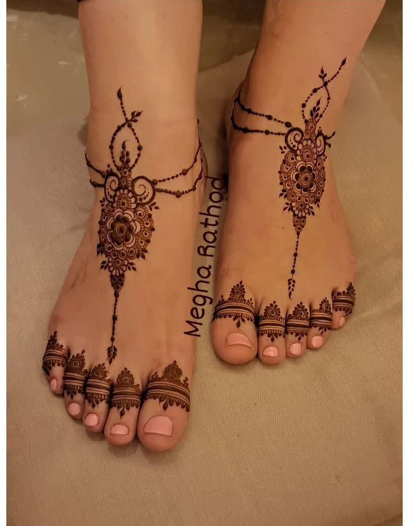 Complete your festive look with beautiful mehendi for your feet. I create elegant designs ranging from simple, jewellery-like anklets to more elaborate patterns that cover the entire foot, ensuring you are adorned from head to toe.