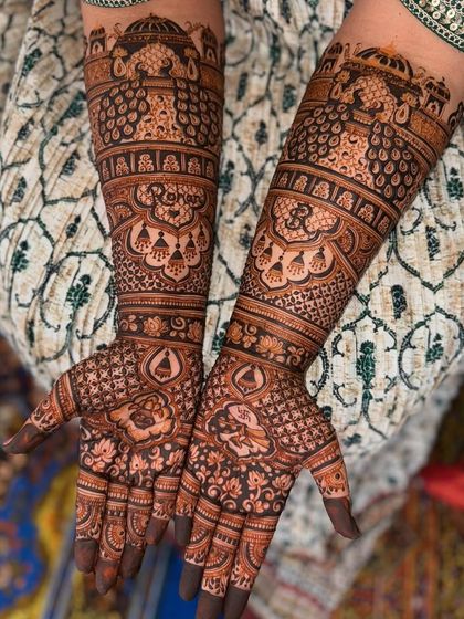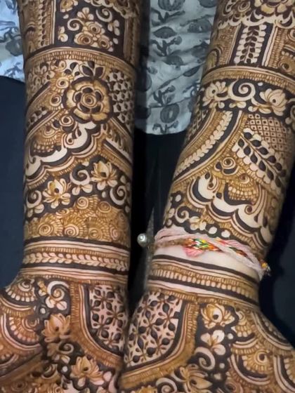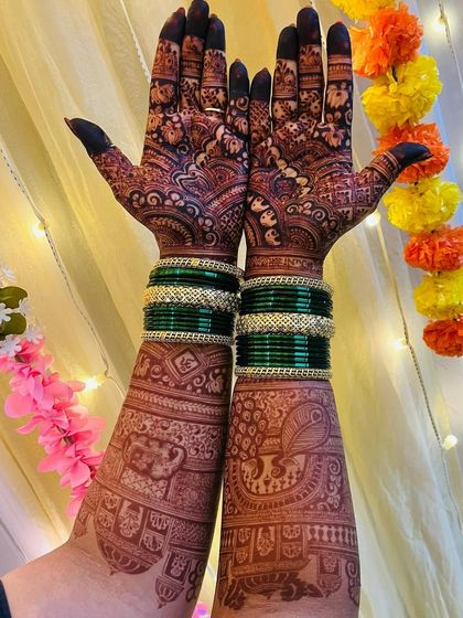 I design bridal mehendi with custom elements like your pets, dates, or city skylines, and use my own natural henna blend for a deep stain on both hands and feet in one sitting.