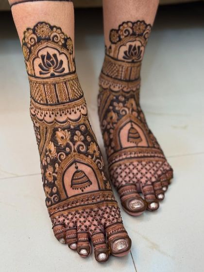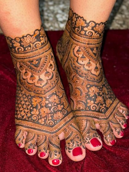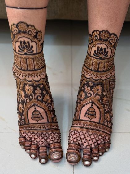I create detailed and elaborate mehendi designs specifically for feet, incorporating traditional motifs like lotus flowers and bells. My feet mehendi service is particularly popular for bridal occasions, featuring symmetrical patterns and Indo-Arabic influences.