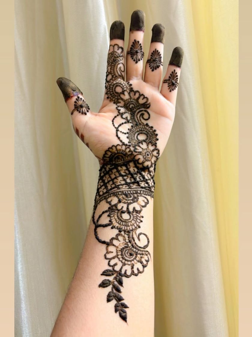 I love the elegance of Arabic mehendi, which typically features bold, vine-like patterns that trail up the hands or feet. This style uses negative space to create a striking contrast, making it perfect for parties, festivals like Eid, or for anyone who wants a modern yet traditional look.
