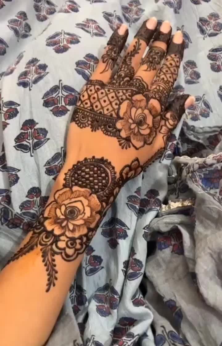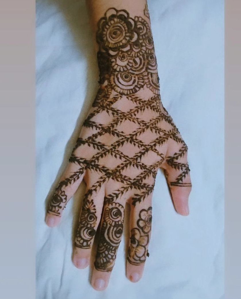 For those who love detailed and full designs, I offer intricate Indian mehendi. These patterns often include fine lines, checks, dots, and traditional motifs that cover more of the hand for a rich look.