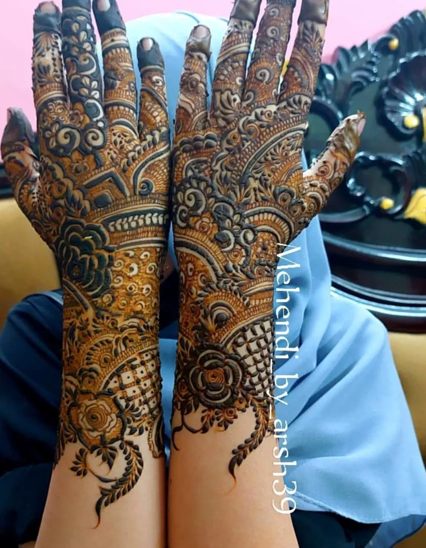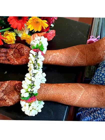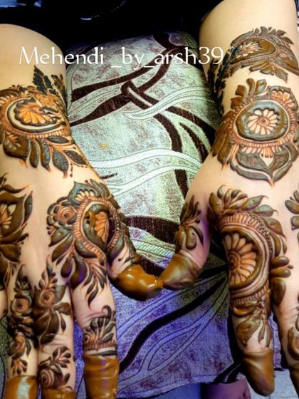 My passion is creating full, elaborate henna designs for brides. I blend traditional elements like paisleys and mandalas with contemporary floral patterns, covering the hands and arms to create a breathtaking masterpiece for your wedding day.