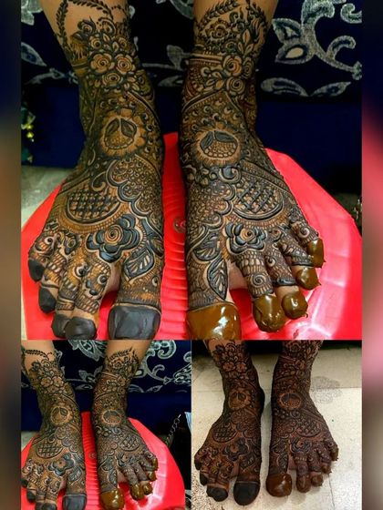 Complete your ceremonial look with beautiful henna on your feet. I create designs that complement your hand mehndi, from simple patterns on the toes and top of the foot to full coverage that resembles traditional payals (anklets).