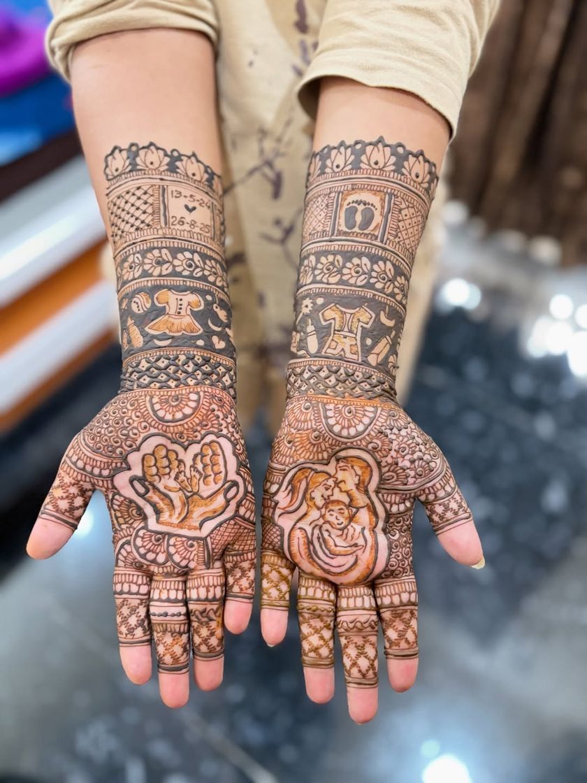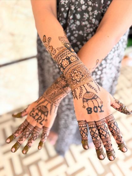 Celebrate the wonderful journey to motherhood with a design that tells your story. I create personalized mehendi for seemantha ceremonies, featuring elements like baby footprints, "Mom to be" text, parent-and-child portraits, or even your due date. All designs are done with my safe, chemical-free organic henna.