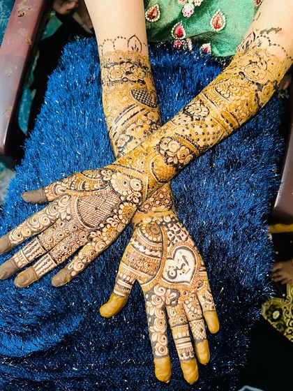 I specialize in creating intricate bridal henna designs across Indian, Pakistani, and luxury styles. My designs feature detailed patterns covering hands, arms, feet, and legs, incorporating personalized elements like names and initials alongside traditional motifs of florals, paisleys, and geometric shapes.