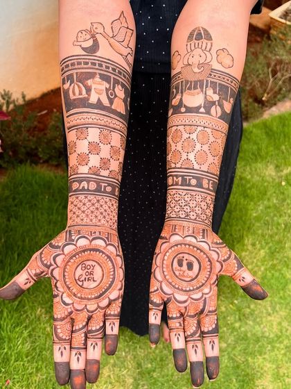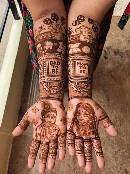 I create custom baby shower mehendi with portraits, baby-themed designs, and safe organic henna, all tailored to your story.