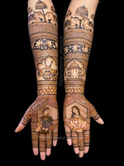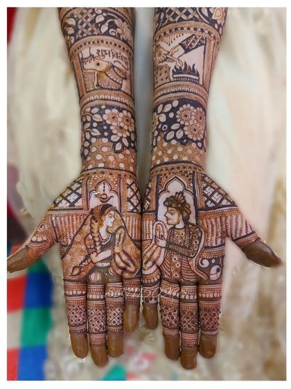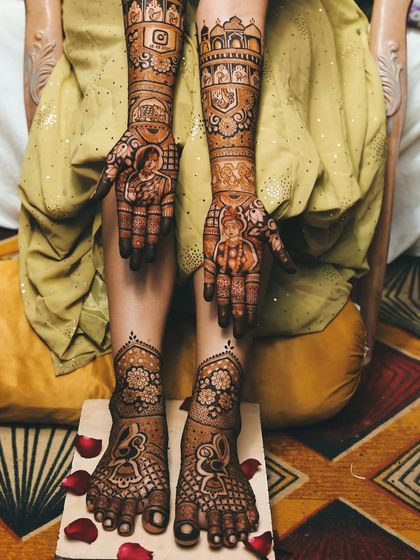 I create bridal mehendi with custom portraits, personal details, and traditional motifs using my own natural henna paste for a dark stain, and I include designs for family and bridesmaids too.