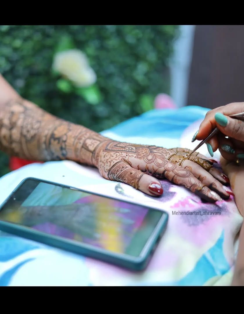 The secret to beautiful mehendi is twofold: skilled artistry and high-quality henna. Here, you can see me at work, meticulously applying each detail. I also showcase the stunningly dark stain my clients get, which is the result of my fresh, 100% natural henna paste.