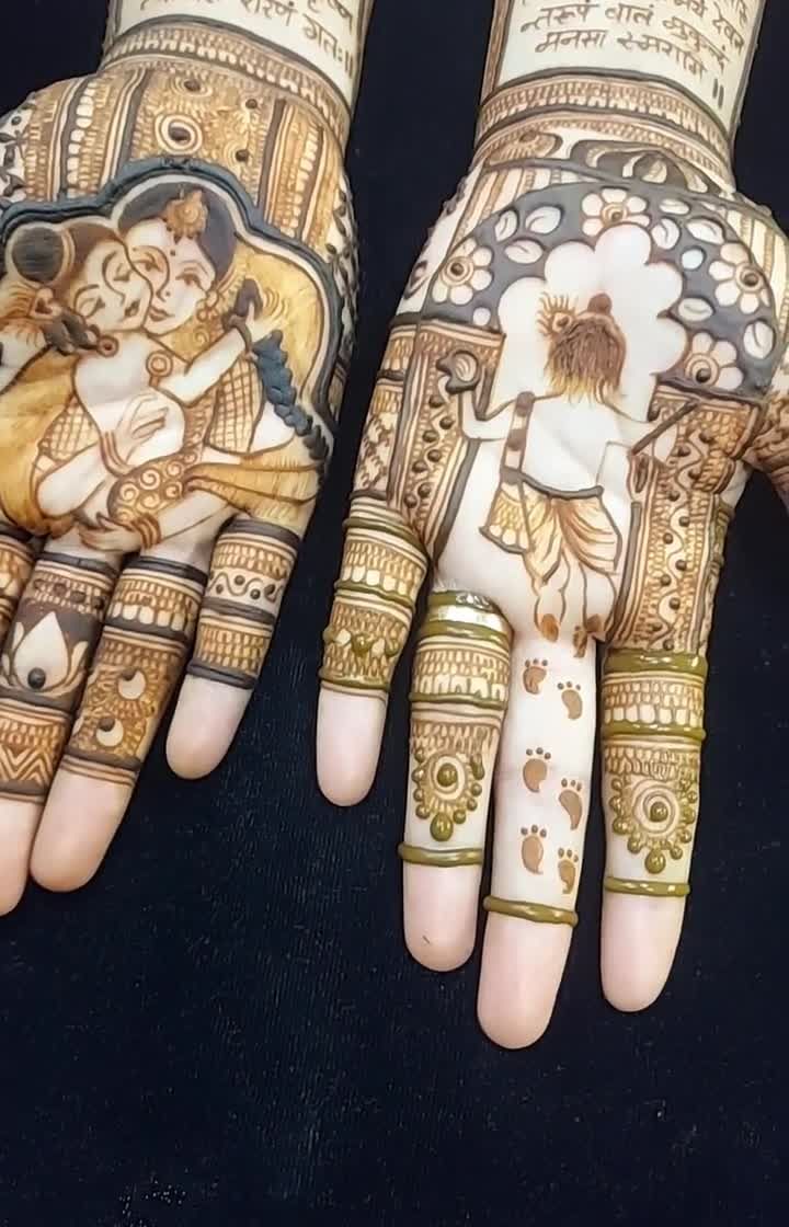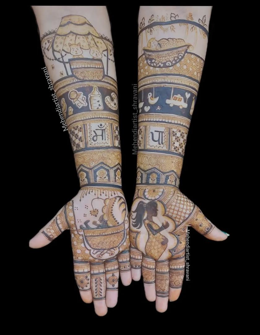 Celebrate the journey to motherhood with a special baby shower mehendi. I create heartwarming designs that include baby-related motifs like cradles and rattles, parent-to-be silhouettes, and even portraits of your pets. We can also include names like 'Maa' and 'Paa' to make it extra special.