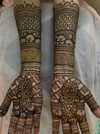 My focus is on creating dense, full-coverage bridal mehendi with a variety of detailed patterns. I use different techniques like fine lines, bold fills, and delicate shading to create a rich and striking texture.