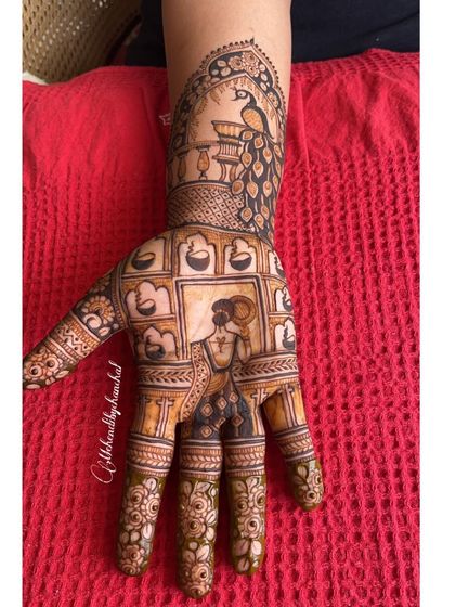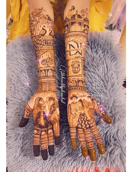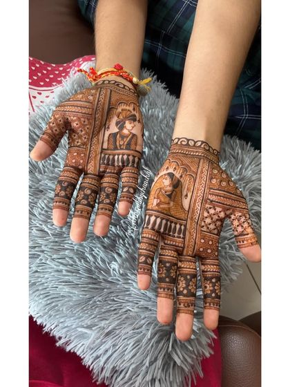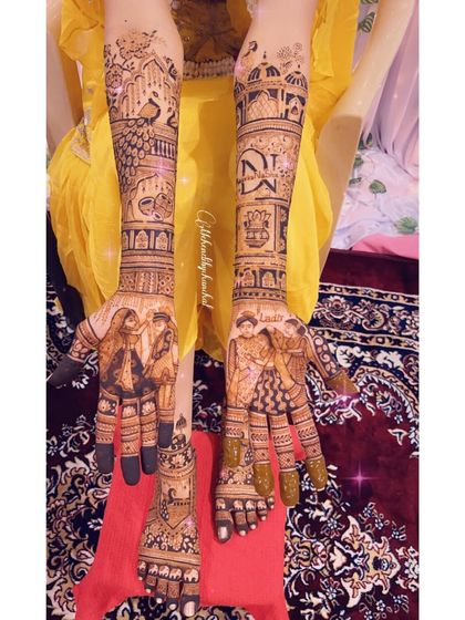 I design bridal mehendi that includes your personal story, portraits, and custom details, covering hands and feet with intricate patterns.