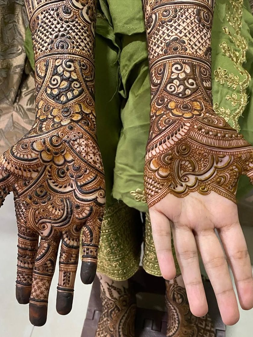 This is my specialty and my passion. These designs are for the bride who dreams of traditional, full-coverage mehendi. Each arm is a canvas for dense, detailed patterns, from classic paisleys and florals to intricate jaali (net) and geometric fills, creating a breathtaking look for your shaadi.
