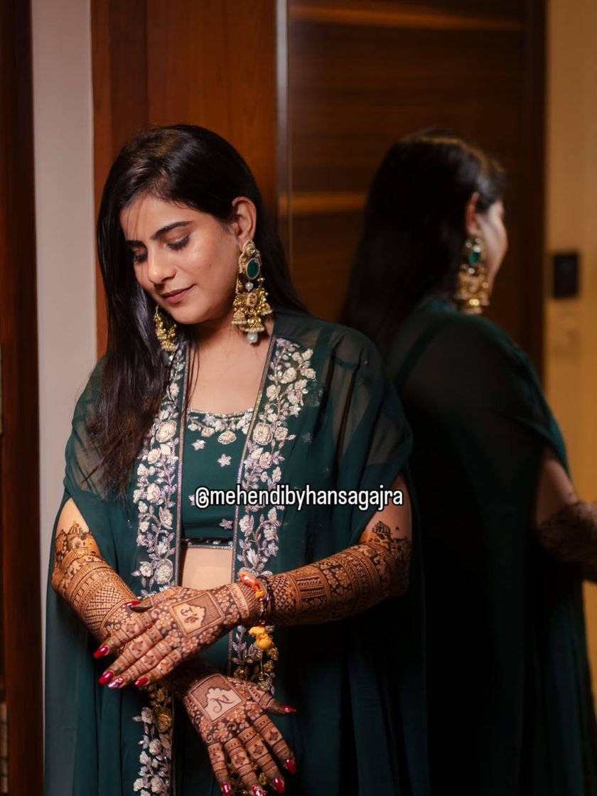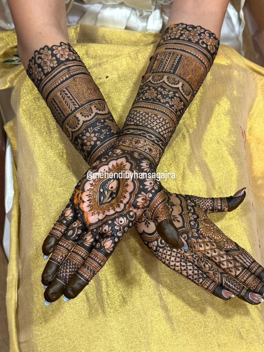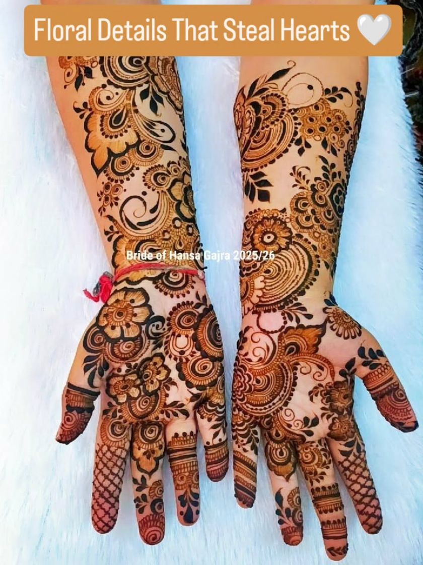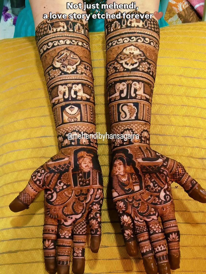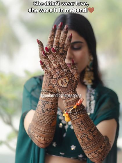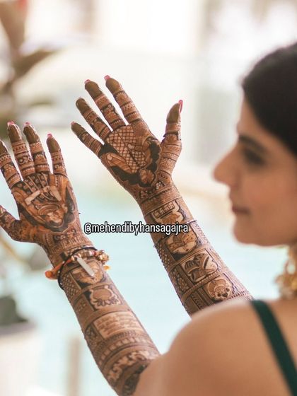 For the bride who dreams of a classic, royal look. I create intricate, full-coverage designs featuring traditional motifs like peacocks, elephants, lotuses, and detailed jaali (net) work that extends from fingertips to elbows.