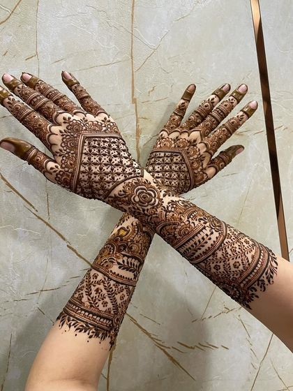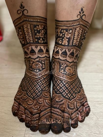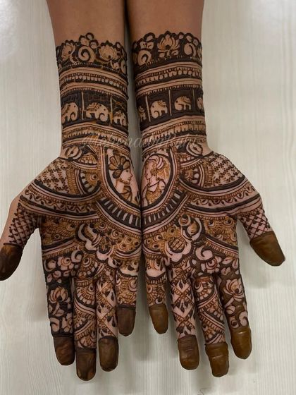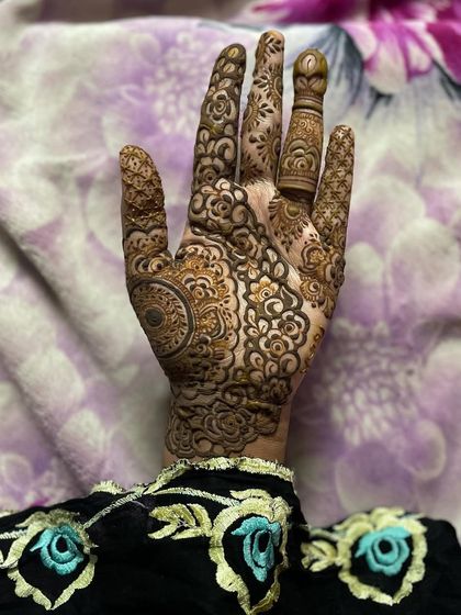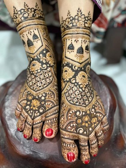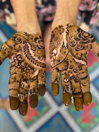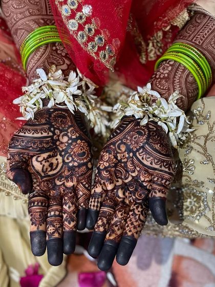 I do bridal mehendi with pure organic paste, full hand and feet coverage, dense patterns, and custom designs like names or symbols.