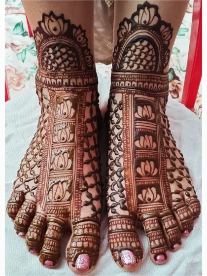 - Feet: Intricate designs covering toes and extending up to the ankle bone with heavy borders or payal patterns.