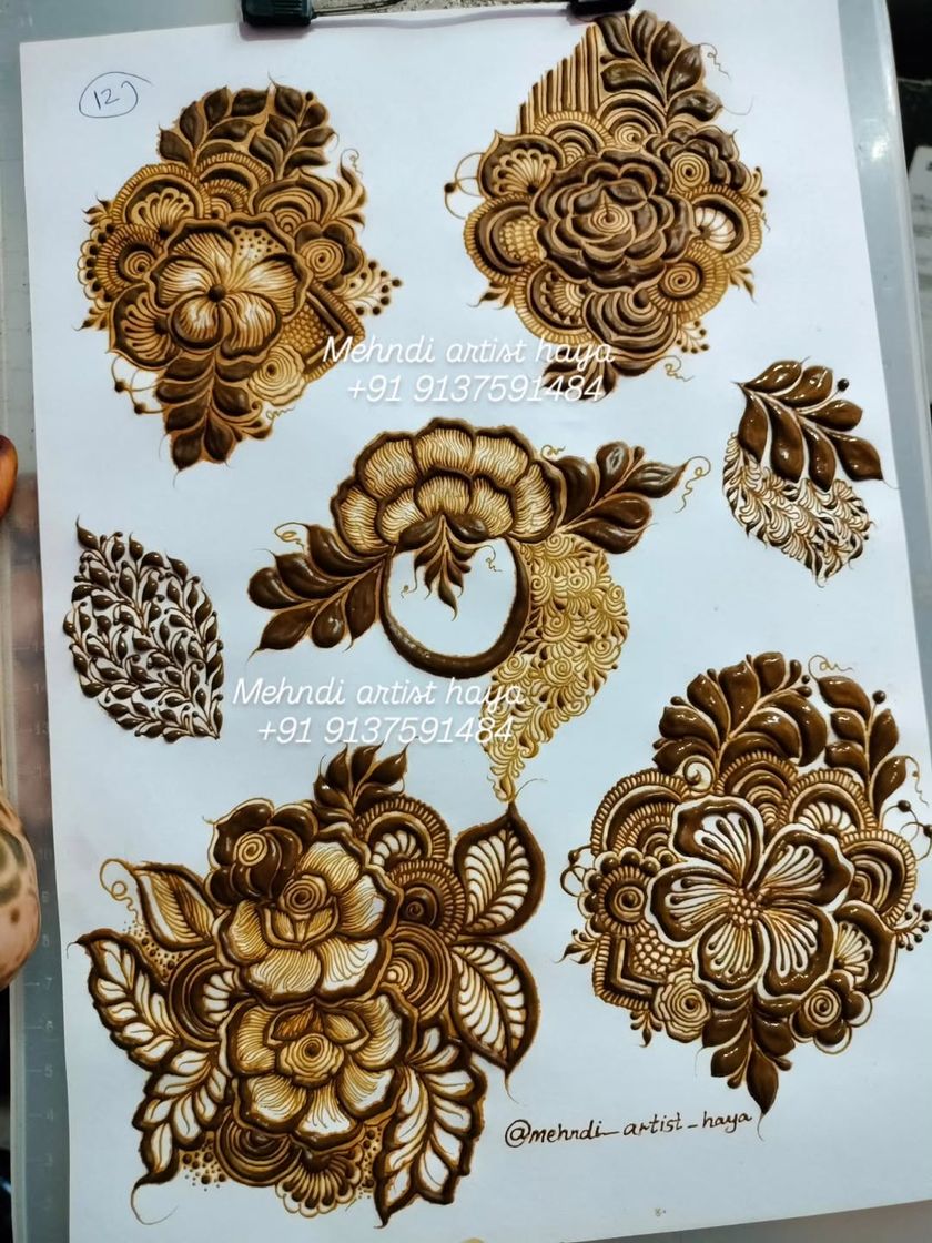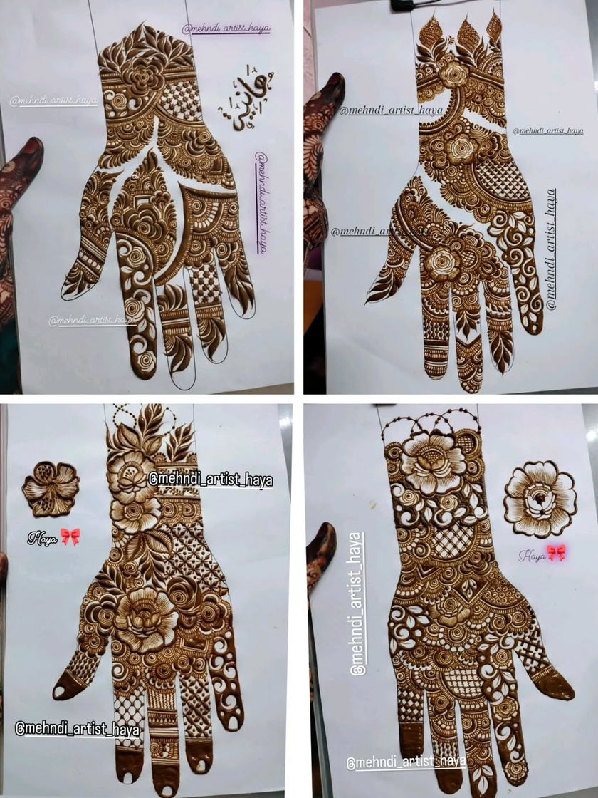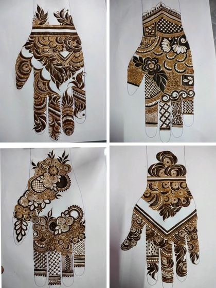 Here is a collection of various designs to show the breadth of styles we cover. From full bridal hands to simpler party patterns, these collages demonstrate the versatility you will gain as a henna artist in my classes.