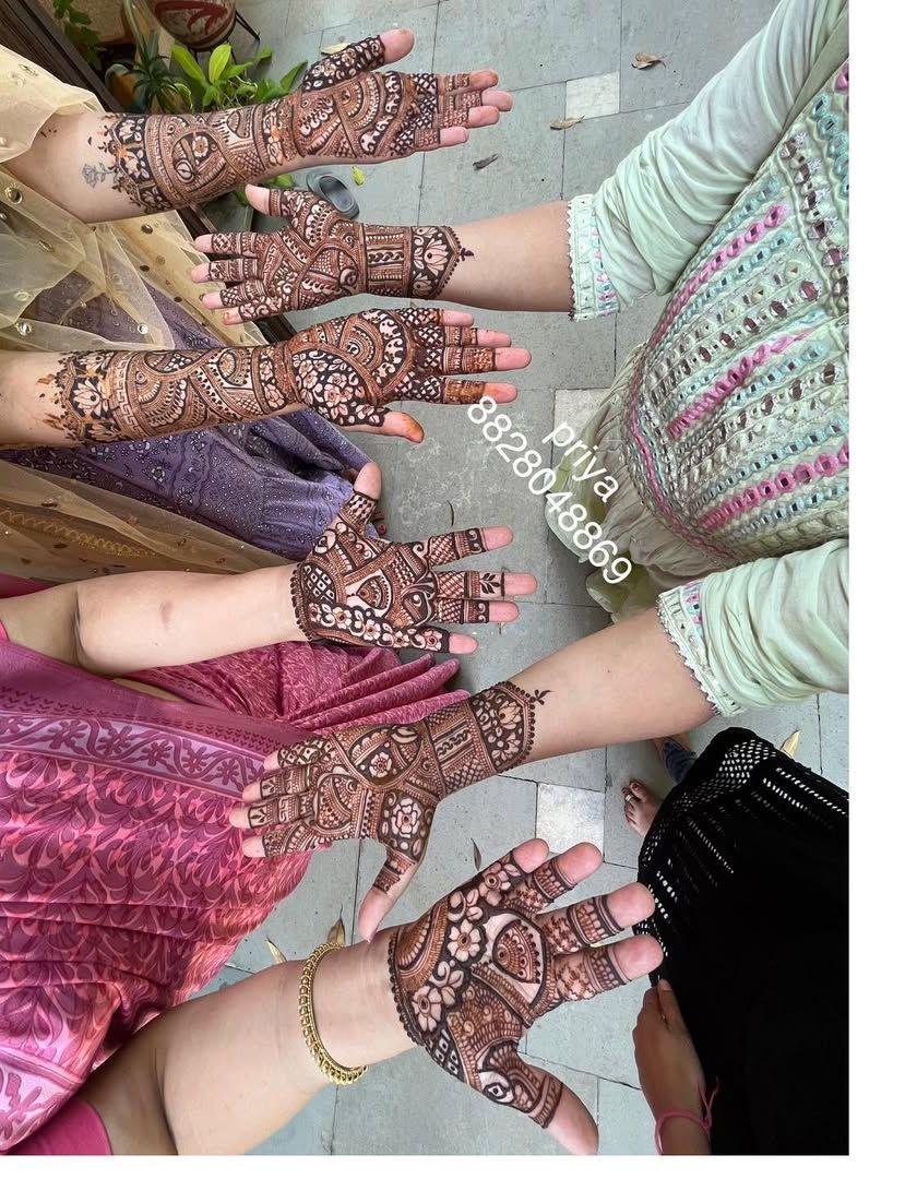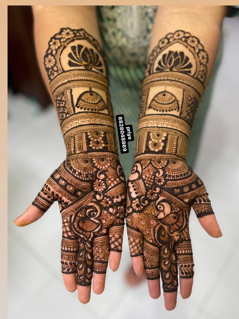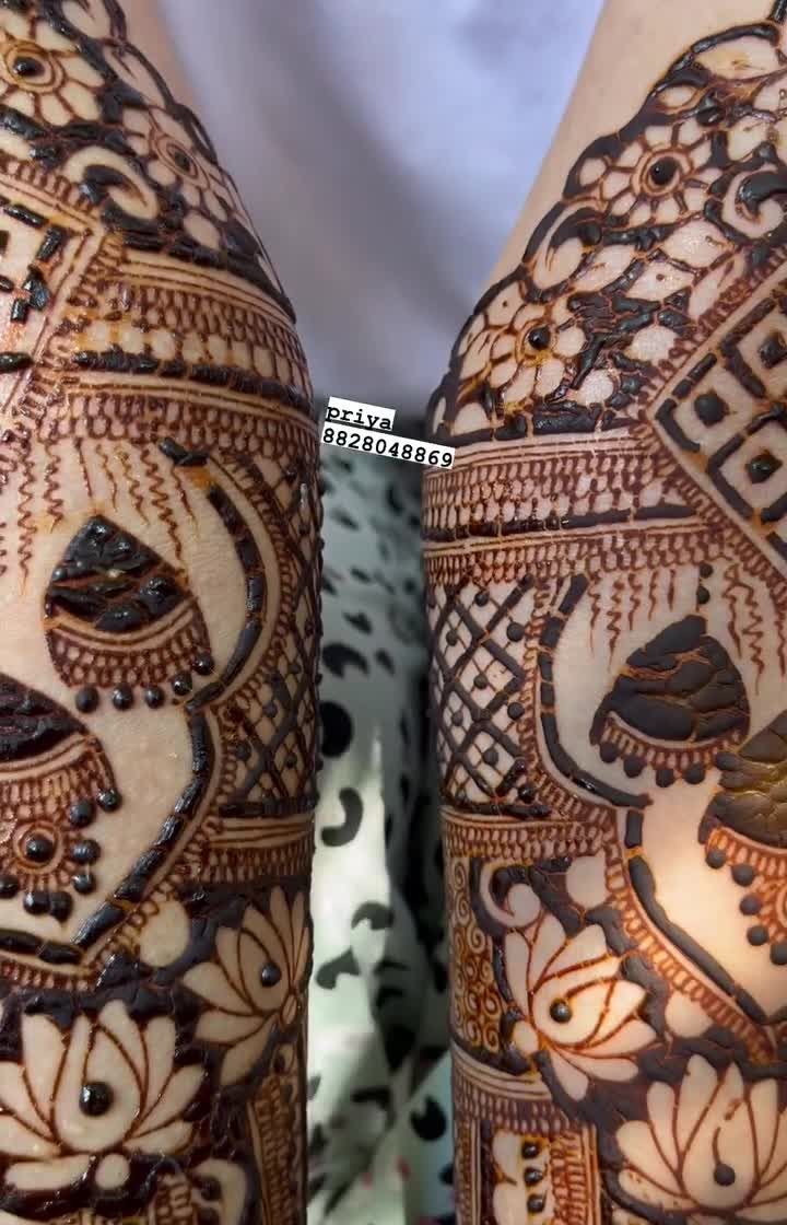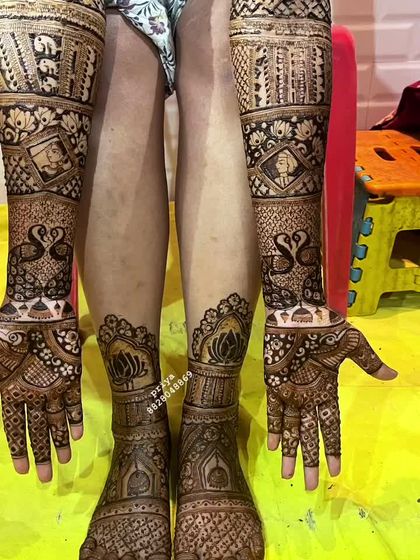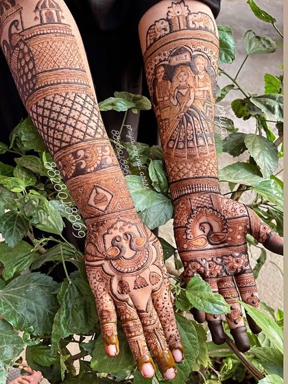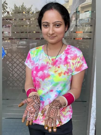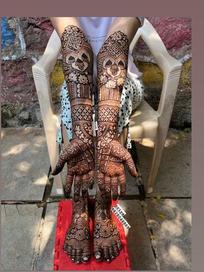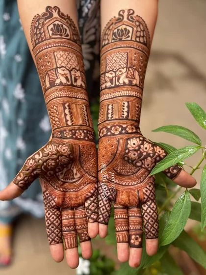 My passion is creating dense and detailed mehndi for hands and arms. I work with traditional motifs like peacocks, elephants, and lotuses, as well as modern geometric patterns, ensuring every bride gets a design she loves.