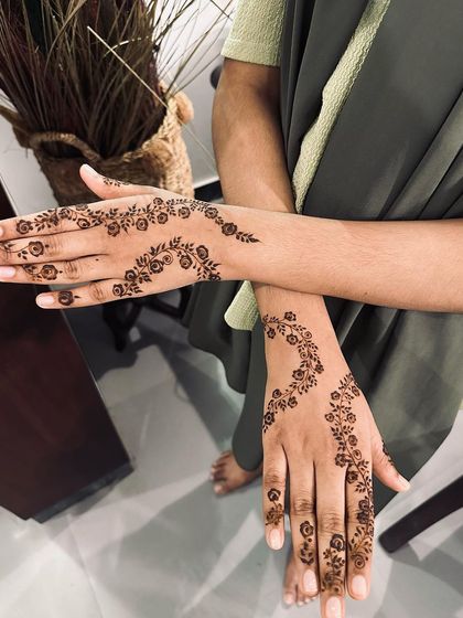 I do custom mehndi for parties and festivals, with both traditional and minimalist designs for hands, arms, or feet, tailored to your event and style.