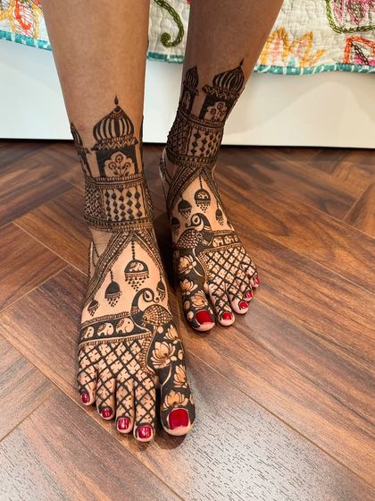 My base is always traditional Indian bridal henna patterns - jaali work, lotus, mandalas, peacocks, elephants, those palace-like jharokhas. I can go heavy and dense or keep it more airy, depending on your vibe.