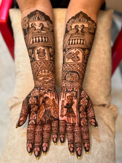 - Portraits: Detailed 'Raja-Rani' sketches of the Bride and Groom on the palms.