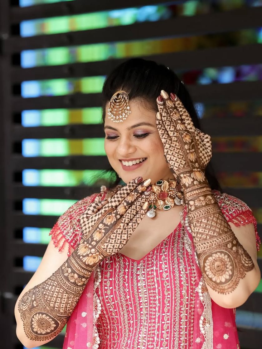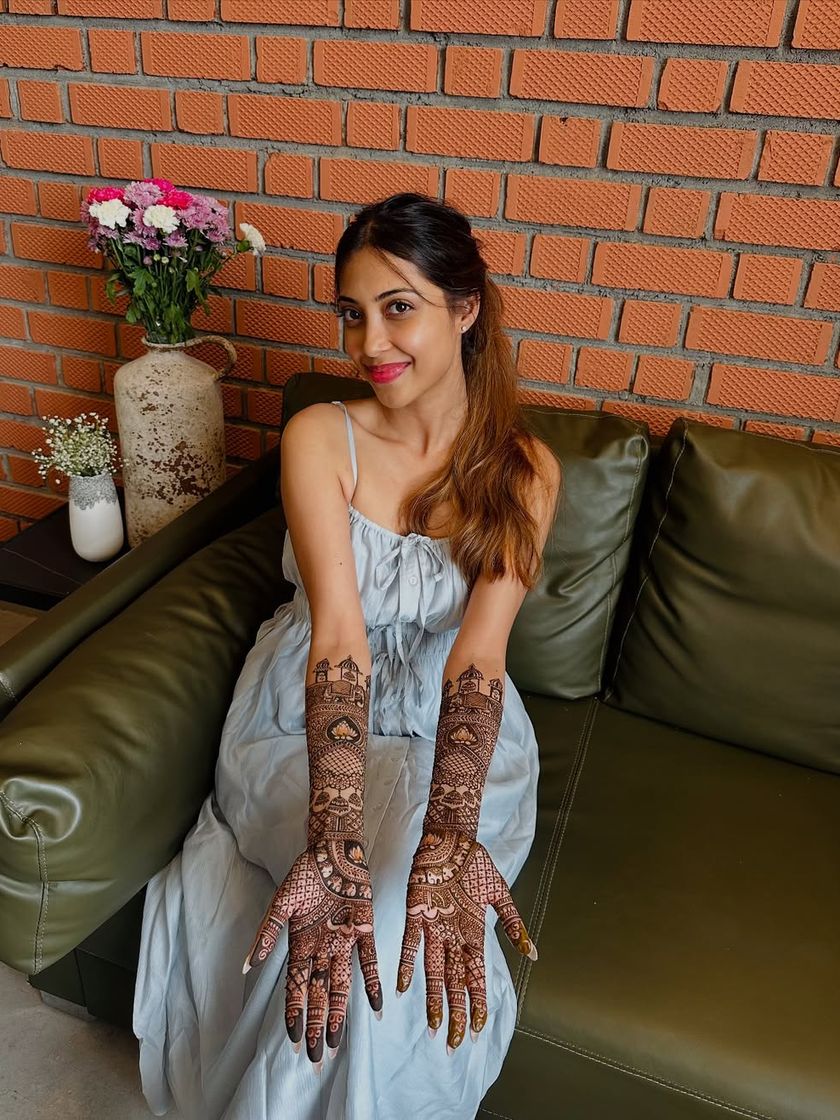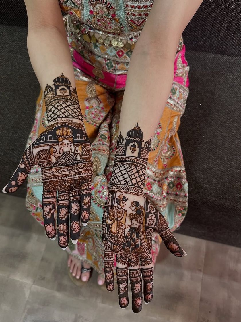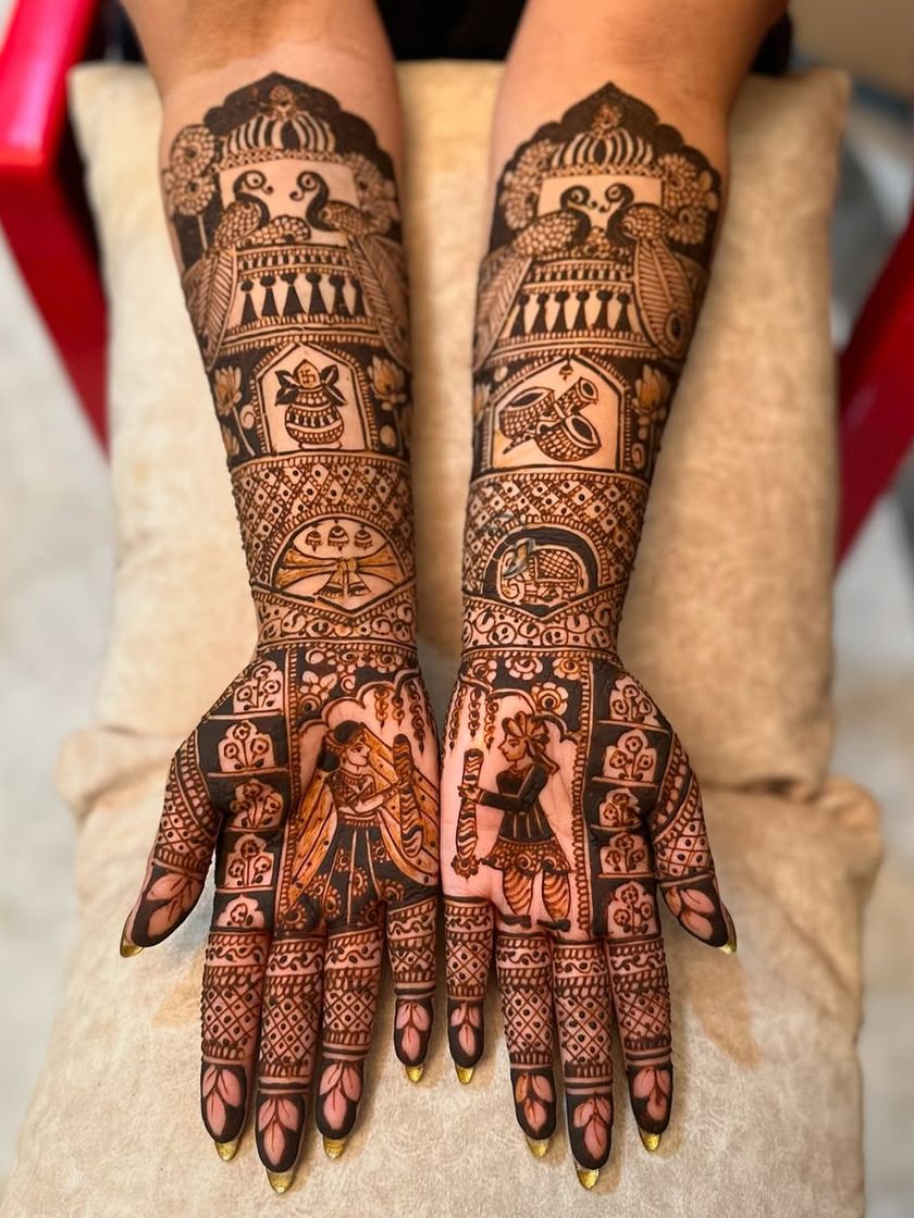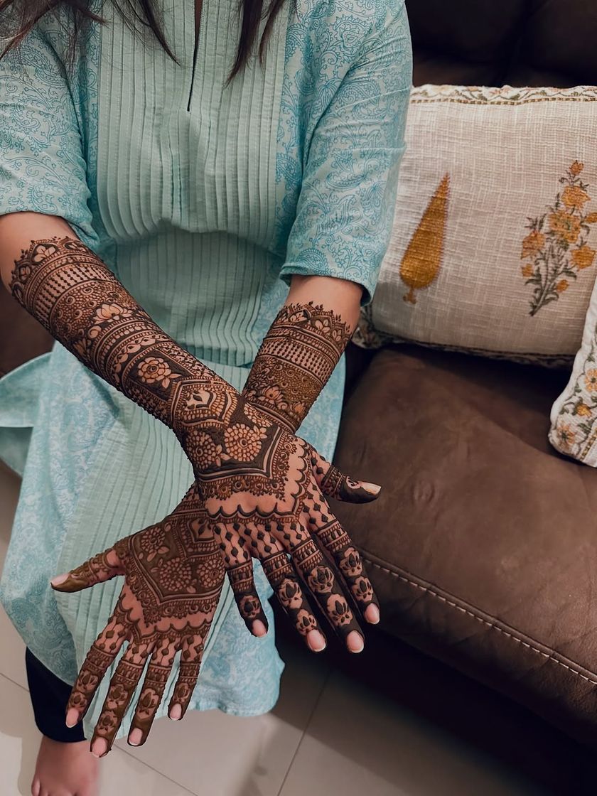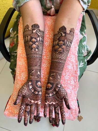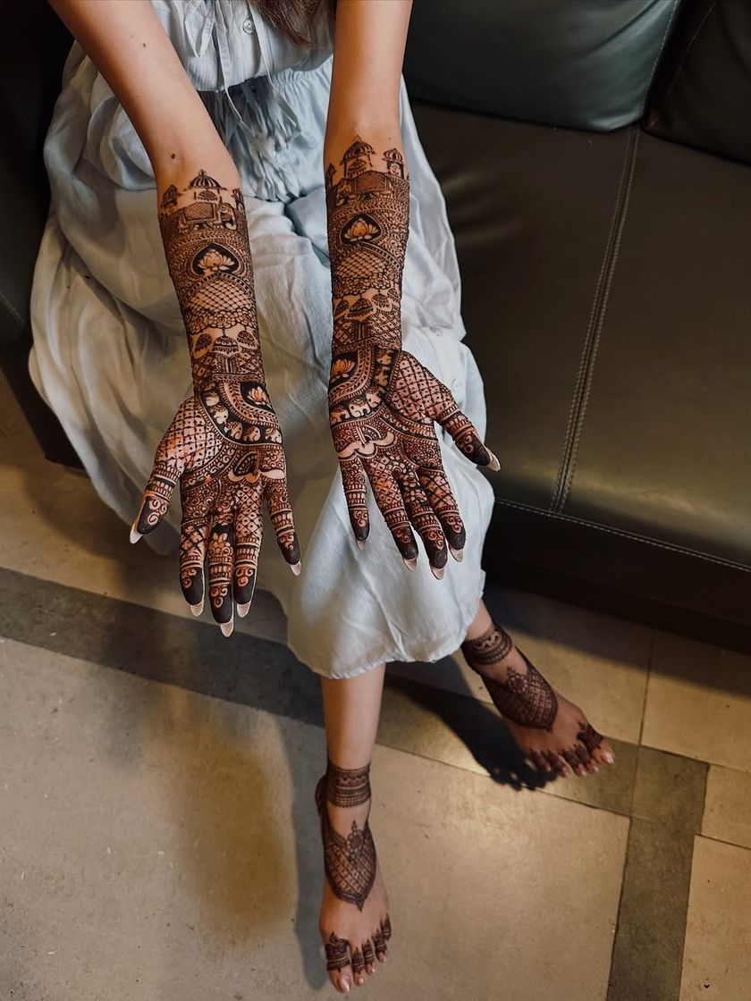 My focus is on creating crisp, clean lines and dense, traditional patterns that extend up the arm. I work with classic Indian motifs like peacocks, elephants, lotuses, and architectural jharokhas, tailored to your preference for a heavy or more airy design.