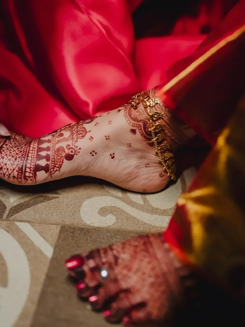 I extend my artistry to create beautiful mehndi designs for the feet and legs. From simple accents to full coverage matching your hand designs, I ensure every detail is perfect for completing your festive look.