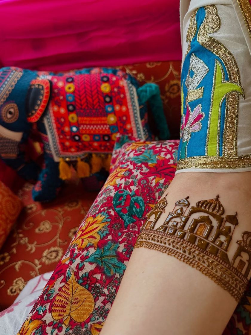 Beyond hands and feet, I design unique mehndi armbands and accent pieces. These are perfect for adding a distinctive touch to your outfit, featuring motifs like architectural skylines, peacocks, or intricate patterns.