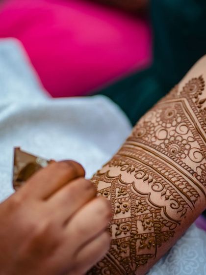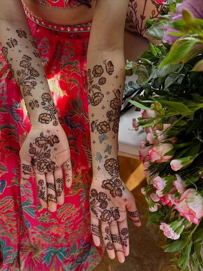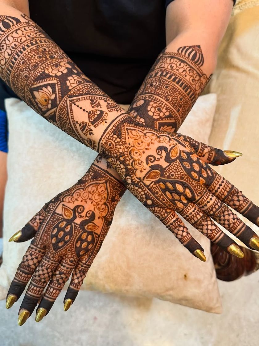 I specialize in classic Indian mehndi, filled with dense patterns and fine details. These designs feature timeless motifs like peacocks, paisleys, and mandalas, with full coverage from palm to forearm for a rich, celebratory look.